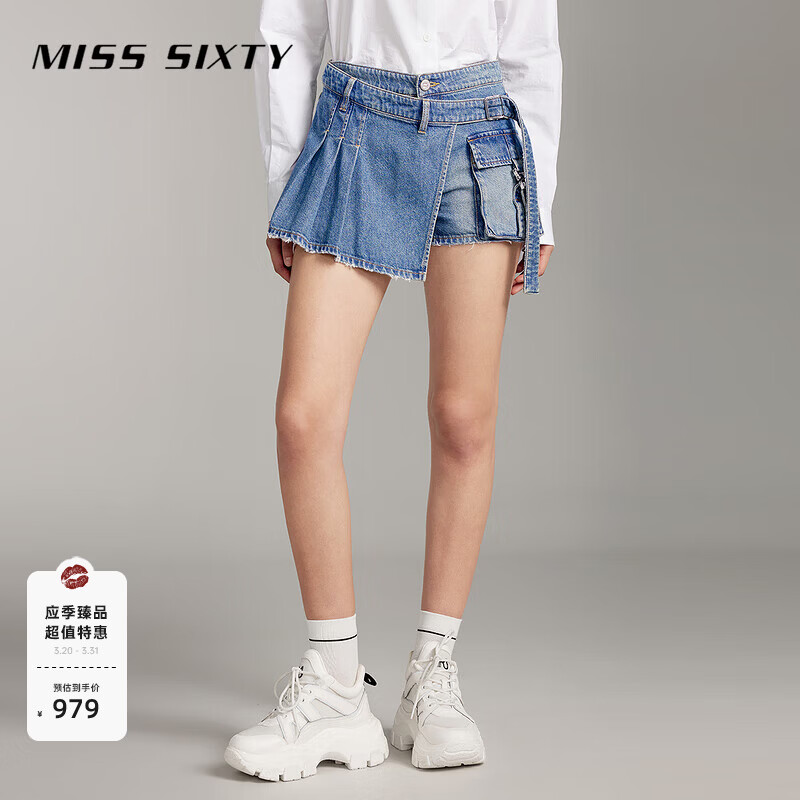 MISS SIXTY夏季新款含醋酸牛仔短裤女复古工装解构式设计裙裤 中蓝 S